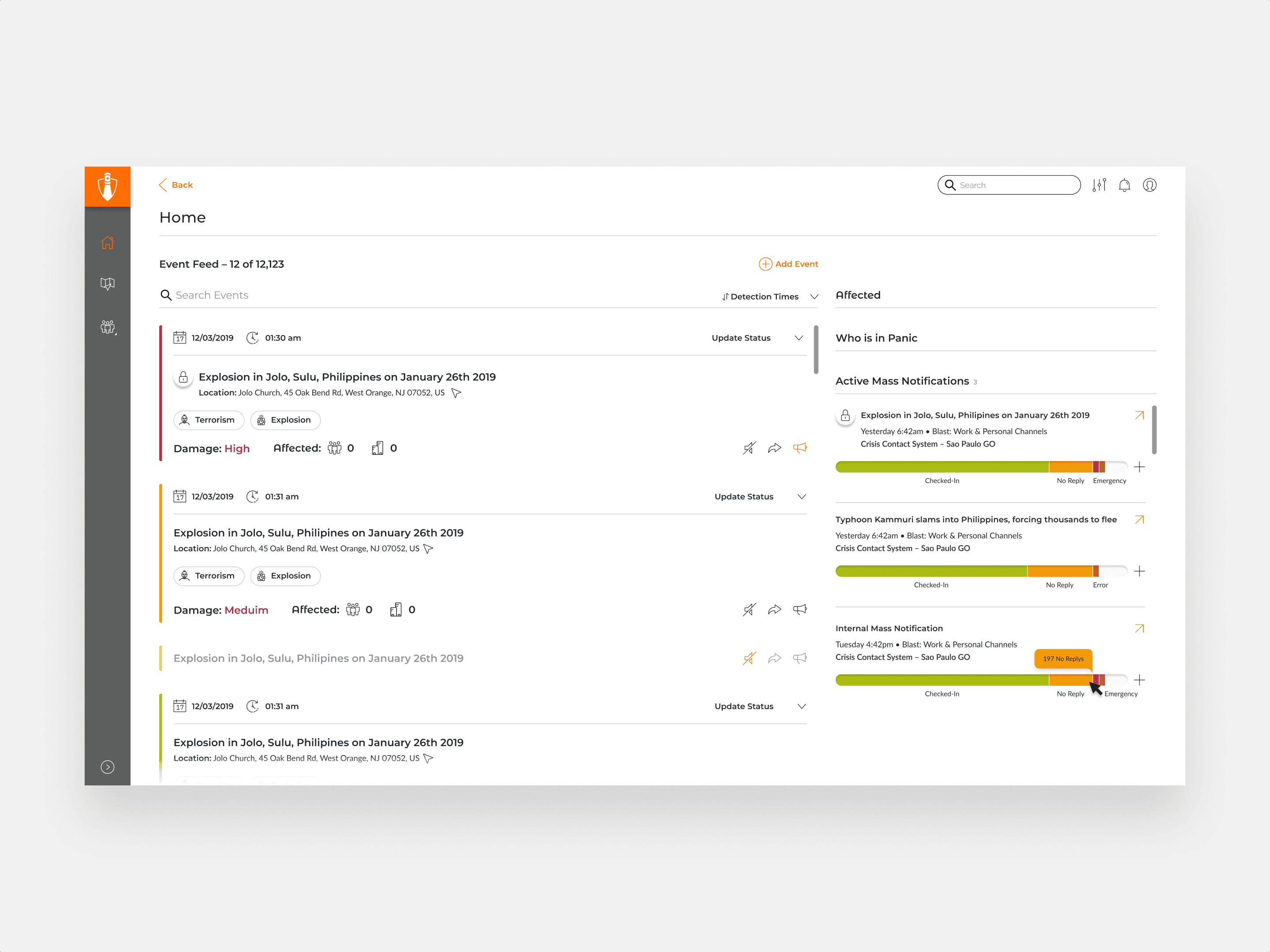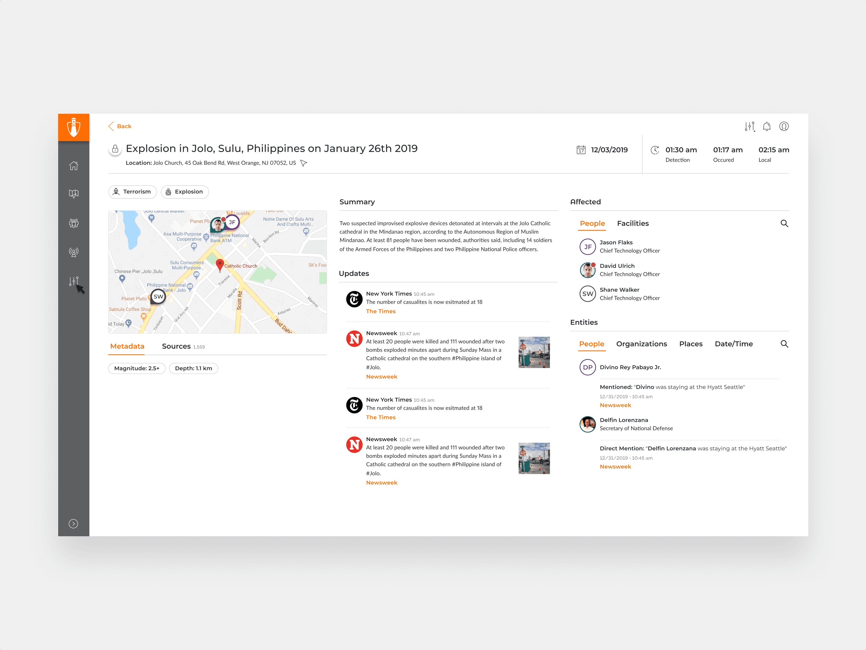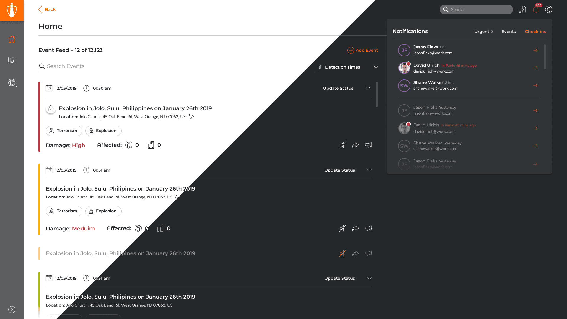 Security and risk teams were working with a platform that buried critical information inside a cluttered interface. When seconds matter, visual noise is a product failure. I redesigned the information hierarchy around a three-state urgency system: passive, attention, alert. The platform shipped as Stabilitas 2.0 and was acquired by OnSolve shortly after. Design assets were used directly in acquisition materials.